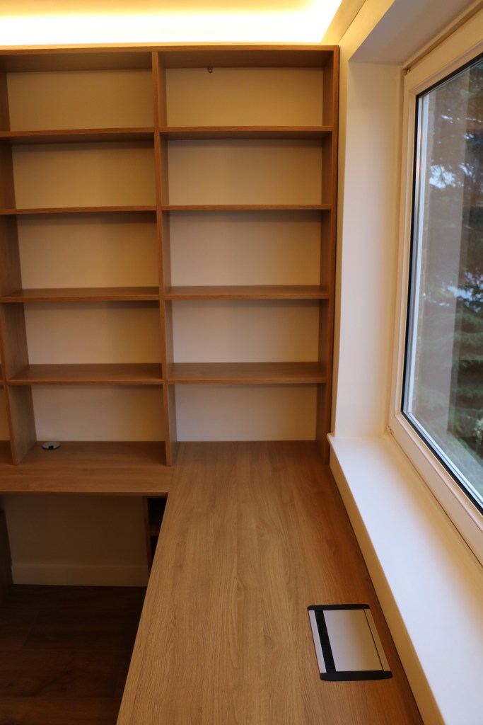 This L-shaped desk with a special printer storage was designed to optimise the size of the room and create a seamless environemtn for the clients tech to slot into. The bookcase is grand and straightforward, secured firmly to the wall and offers enough storagee for any avid reader