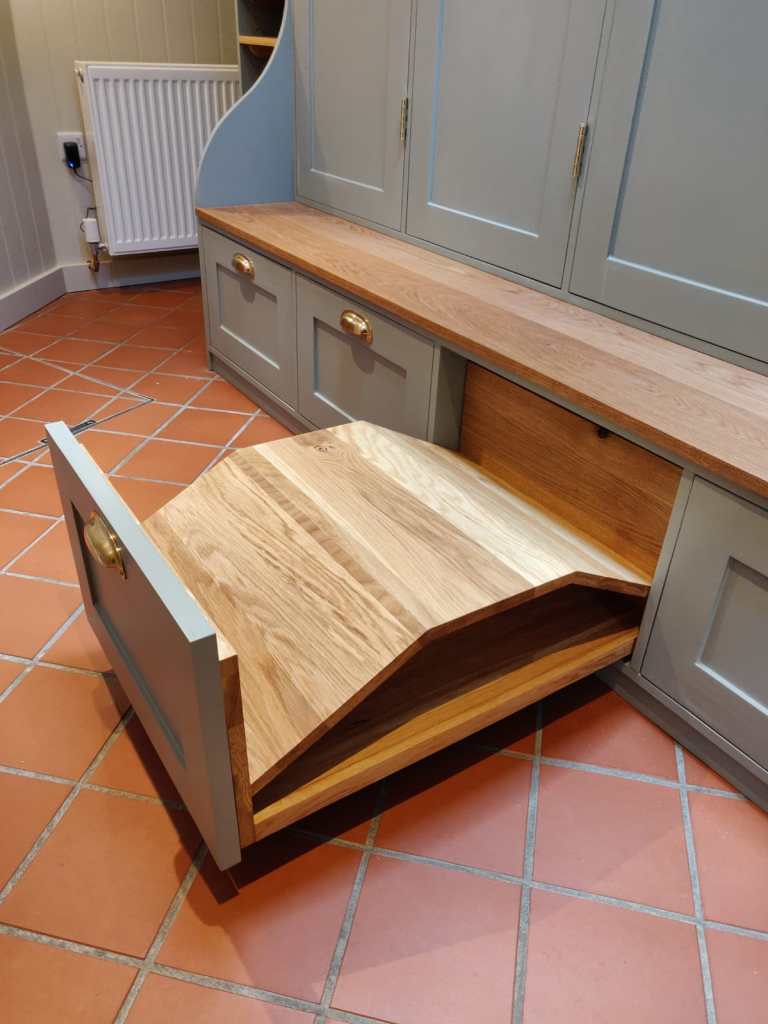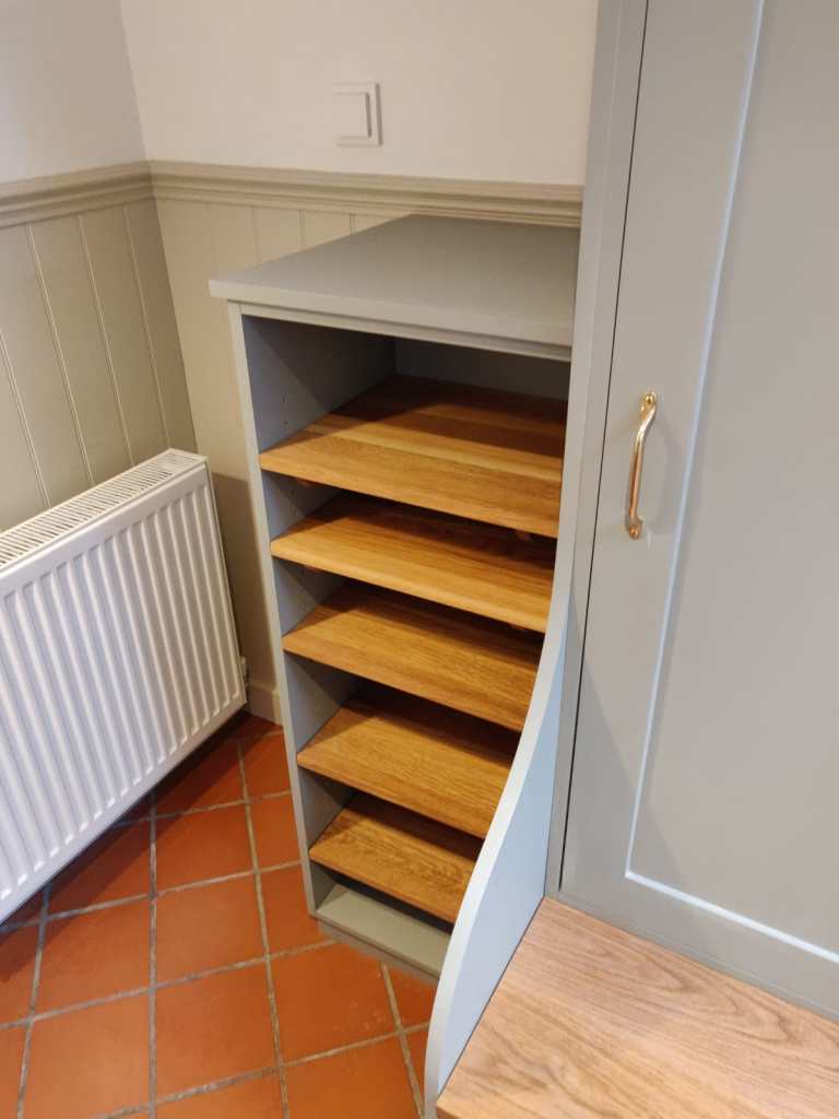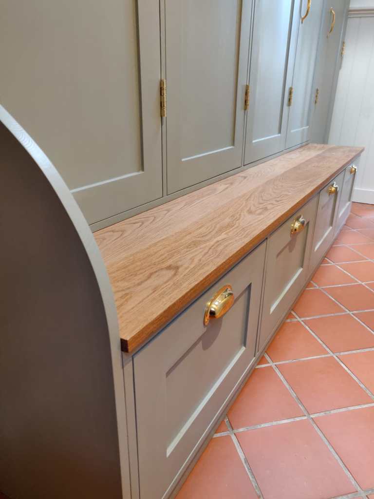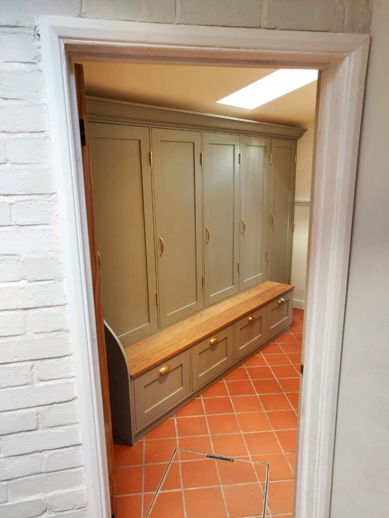 This Soild Wood Porch Unit was made for a family of four in Caterham Valley. The grain popping through the hunter green paint paired with the gold hardware creates a bold and regal environement upon entering the home.
